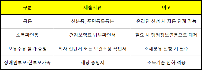 ✅ 온라인 신청 시 대부분의 서류는 전산으로 확인되지만, 조제분유 신청자는 반드시 의사 진단서를 업로드해야 합니다.