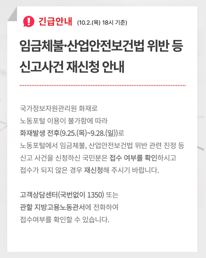 국가정보자원관리원 화재로 인해 노동포털 시스템 이용이 일시적으로 중단됨에 따라, 해당 기간 동안(9월 25일~9월 28일) 접수된 임금체불, 산업안전보건법 위반 등 신고 사건의 일부가 정상적으로 접수되지 않았을 가능성이 있어 재신청 안내가 공지되었습니다.