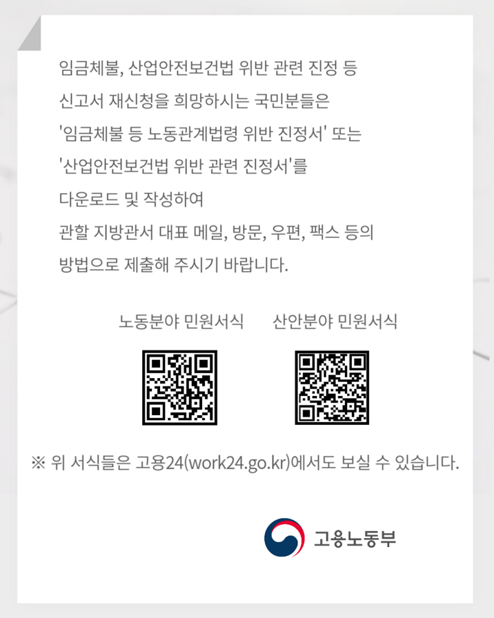 📢고용노동부 임금체불·산업안전보건법 위반 신고사건 재신청 안내